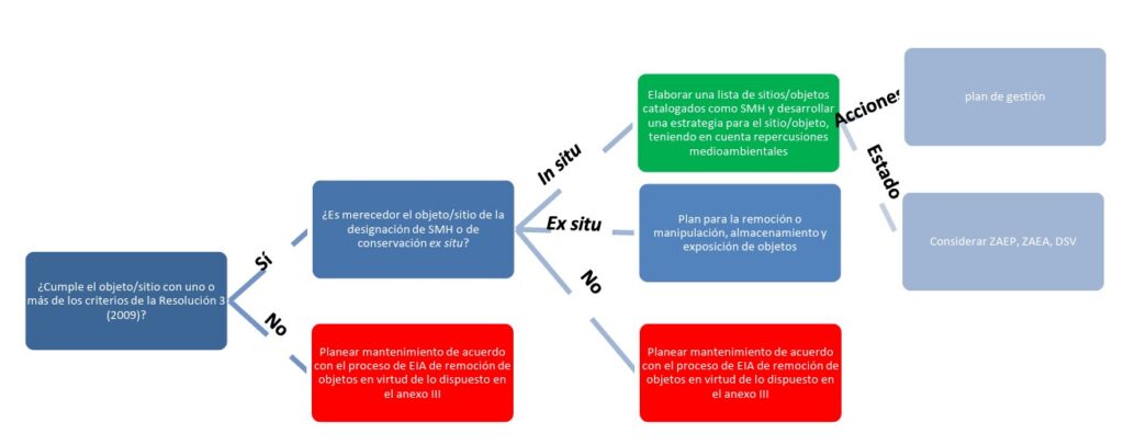 Una vez determinado que un sitio u objeto debe mantenerse in situ en calidad de SMH, se recomienda realizar una evaluación de los desafíos y vulnerabilidades particulares que supone este último, así como considerar las opciones disponibles para su gestión. Al momento de considerar enfoques de gestión, también es necesario tener en cuenta los requisitos del anexo I en relación con la Evaluación de Impacto Ambiental (EIA) y las medidas de mitigación y seguimiento.