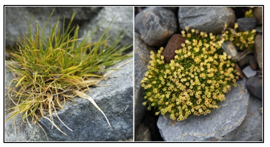 Plantas vasculares antárticas. Izq. Deschampsia antarctica y Der. Colobanthus quitensis