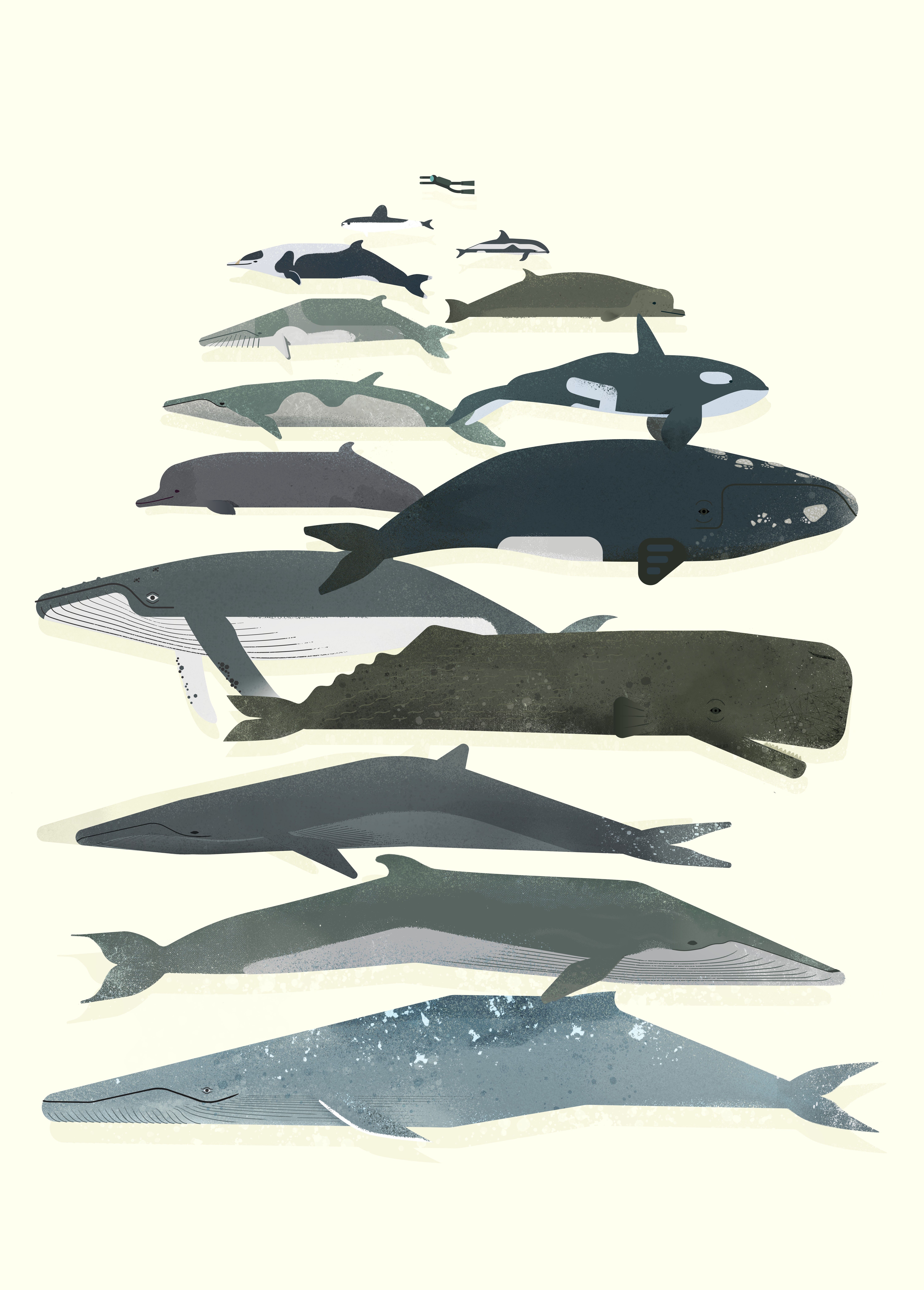 Cetáceos que habitan en los mares antárticos. De arriba a abajo: marsopa de anteojos, delfín cruzado, sifio de Layard, sifio de frente plana, ballena minke enana, orca, minke antártica, sifio de Arnoux, franca austral, jorobada, cachalote, fin o rorcual común, azul.