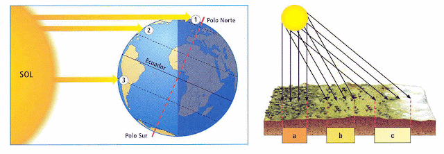 La luz solar (Insolación) llega a la superficie de la Antártida en un ángulo bajo de incidencia y esto significa que la energía solar se extiende sobre un área más grande de lo que sería el caso si la luz solar llegara a la superficie en un ángulo mayor. Al extenderse sobre un área más grande, la energía recibida por unidad de área se reduce.
