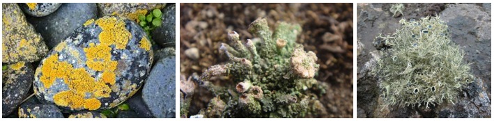 Ejemplos de líquenes antárticos crostosos, foliosos y furticulosos.