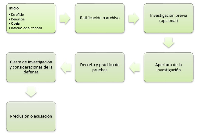 El paso siguiente es la Apertura de Investigación, recordando que la investigación previa es facultativa. La decreta el Representante-Investigador, quien ordenará y practicará las pruebas conducentes (hace las veces de Fiscalía).