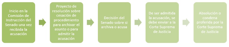 En principio, se reitera lo antes dicho, esto es, que empieza en la Comisión de Instrucción del Senado, una vez se remita la resolución de acusación por parte del presidente de la Cámara de Representantes al presidente de esta Comisión. Luego se lleva a cabo el reparto del expediente entre los 7 senadores que la integran; a quien le corresponda se denominará Senador-Instructor. Éste presentará ante la Comisión de Instrucción un proyecto de resolución admitiendo o rechazando la acusación.